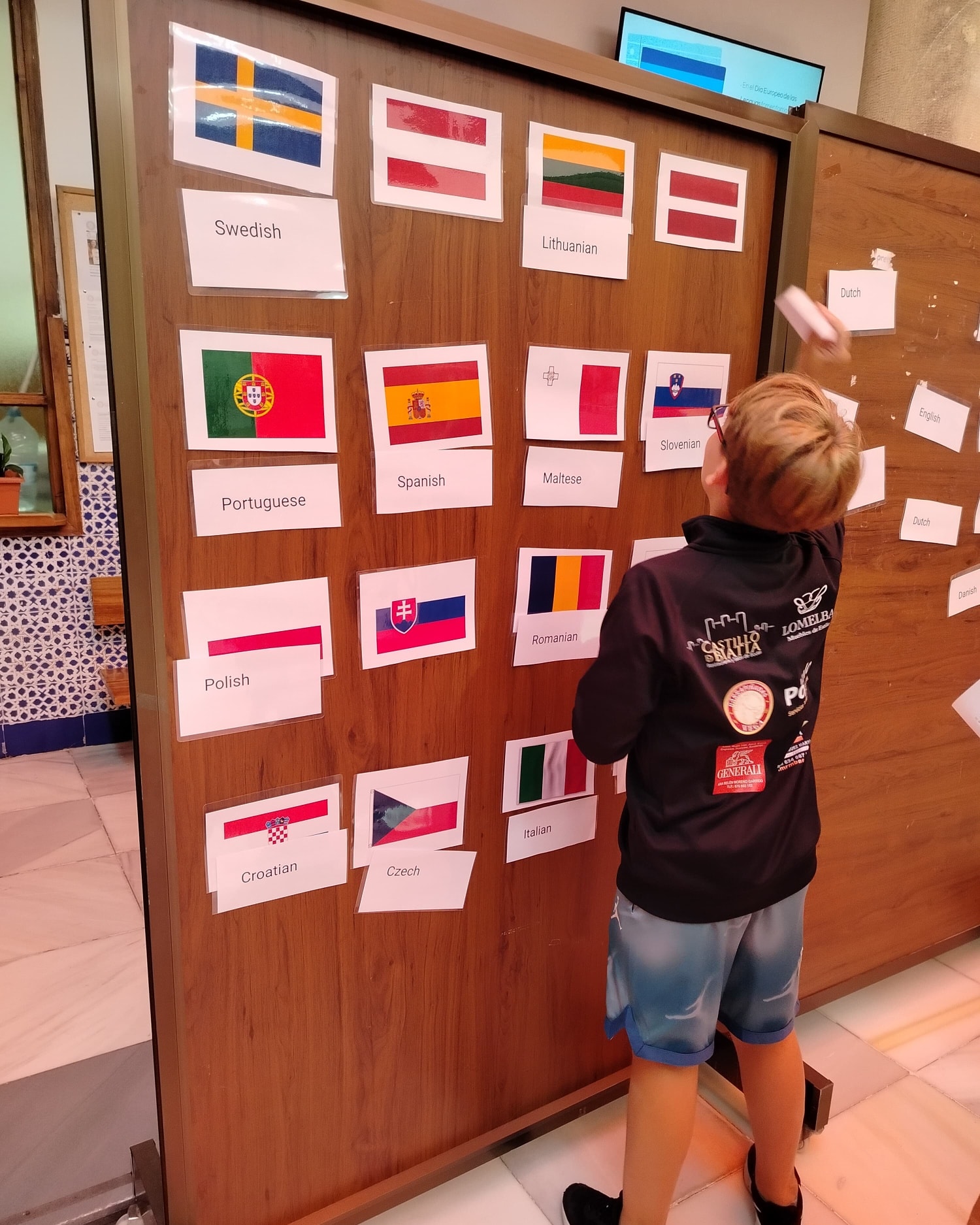 En el recreo, el alumnado de 1º ESO ha demostrado su conocimiento geográfico emparejando cada idioma con la bandera del país donde se habla. Se ha invitado a desayunar a todos los y alumnos y alumnas que lo han solicitado en alguno de los idiomas oficiales de los países europeos.